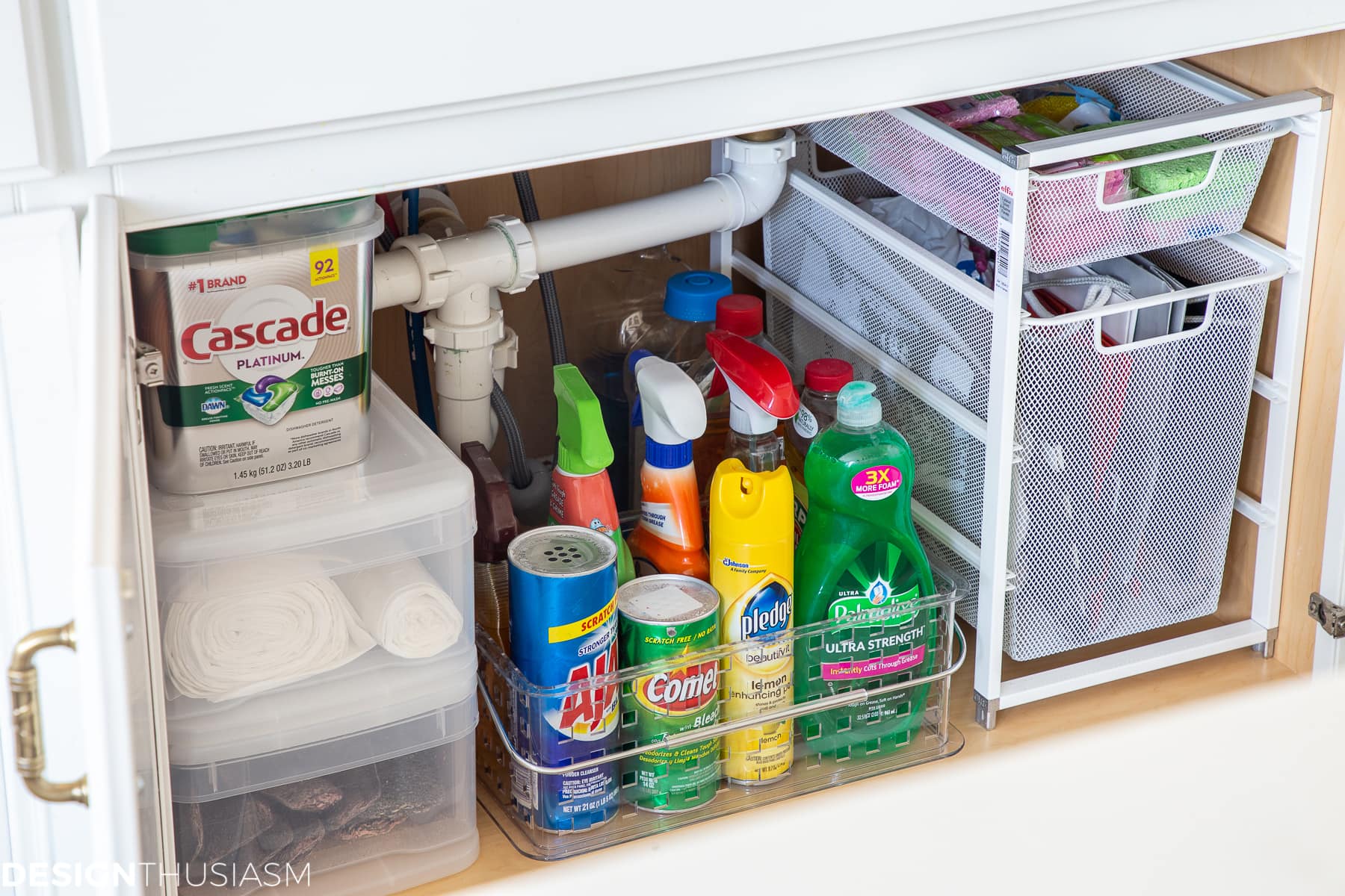 Щоб дрібні господарські товари не перетворювалися на хаотичну купу, використовуйте розділювачі для шухляд. Вони допоможуть створити окремі секції для різних типів губок, серветок та щіток.