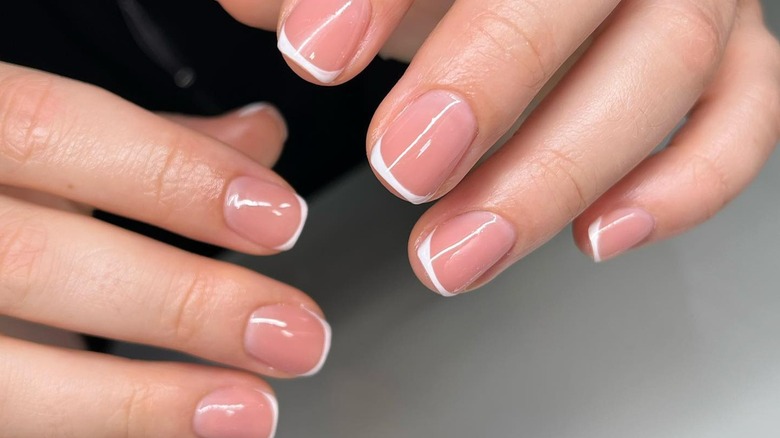 Особливу роль відіграє правильна форма нігтя — злегка закруглена або "сквовал" ідеально поєднується з класичною смугою. Така комбінація візуально подовжує короткі нігті та приховує можливі недоліки форми. Тонка біла лінія виглядає делікатно і не "з'їдає" простір, що критично важливо для коротких нігтів.