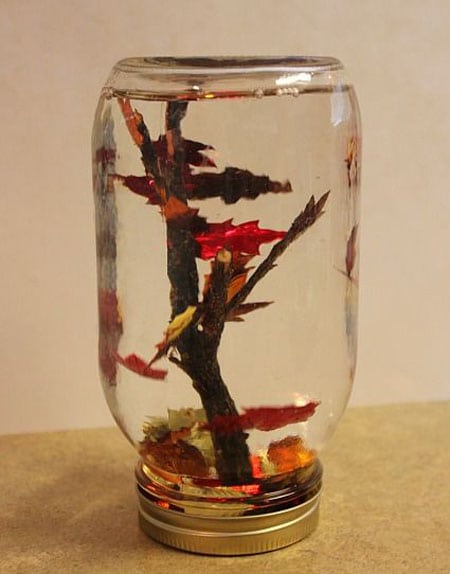 Врахуйте, що не слід заповнювати банку розчином доверху. Також беріть до уваги обсяг гілок, щоб розчин не переливався через верх. Ваш осінній подарунок у вигляді скляної кулі готовий. Єдине, що можна зробити, – це прикрасити кришку декоративними стрічками, шнурком і т. д.