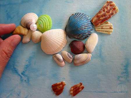 Можна зробити начерк композиції простим олівцем на фоні. Тепер викладіть на цьому фоні з черепашок і камінчиків ваш малюнок. Якщо вас все влаштовує, приклейте мушлі та камінчики до фону в потрібному порядку. Якщо якихось деталей не вистачає, їх можна домалювати.