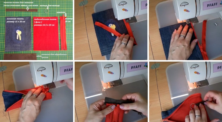 Вивертаємо на лицьову сторону виріб. Слід зробити оздоблювальну стрічку і на другій частині блискавки. Починаємо обробляти бічну сторону, потім вивертаємо ключницю і перевіряємо, виходить все чудово. Вивернули назад, обрізали зайве і за допомогою смужки тканини пристрочуємо її з одного боку, потім перевертаємо виріб і, загорнувши, пристрочуємо. У нас вийшов гарний оброблений край.