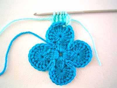 - З боку вивороту квітки «за ніжки» стовпчиків попереднього ряду ( 5, 6, 7, 8) вив'язуємо ще 4 стовпчики з 2 накидами, залишаючи останні петлі на гачку, і отримуємо на гачку 5 петель.