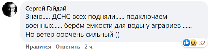 Голова Луганської ОДА Сергій Гайдай відреагував на пост і повідомив, що підняті сили ДСНС, підключають військових, ємності для води беруть у аграріїв. За словами Гайдая, техніка стягується з усієї області і підключаються сусідні.