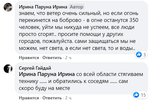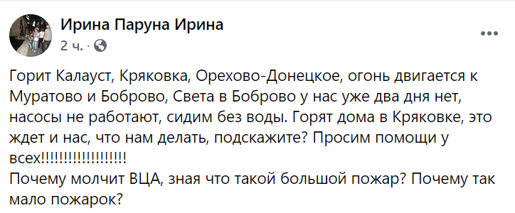 "Горить Калауст, Кряківка, Оріхове-Донецьке, вогонь рухається до Муратово і Боброво, світла в Боброво у нас вже два дні немає, насоси не працюють, сидимо без води. Горять будинки в Кряківці, це чекає і нас, що нам робити, підкажіть? Просимо допомоги у всіх!" - написала в Фейсбуці місцева мешканка.