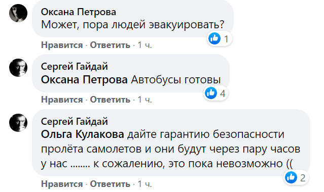 Гайдай також повідомив, що автобуси для евакуації людей готові. Задіяти авіацію для гасіння пожеж, за його словами, неможливо, оскільки немає гарантій безпеки.