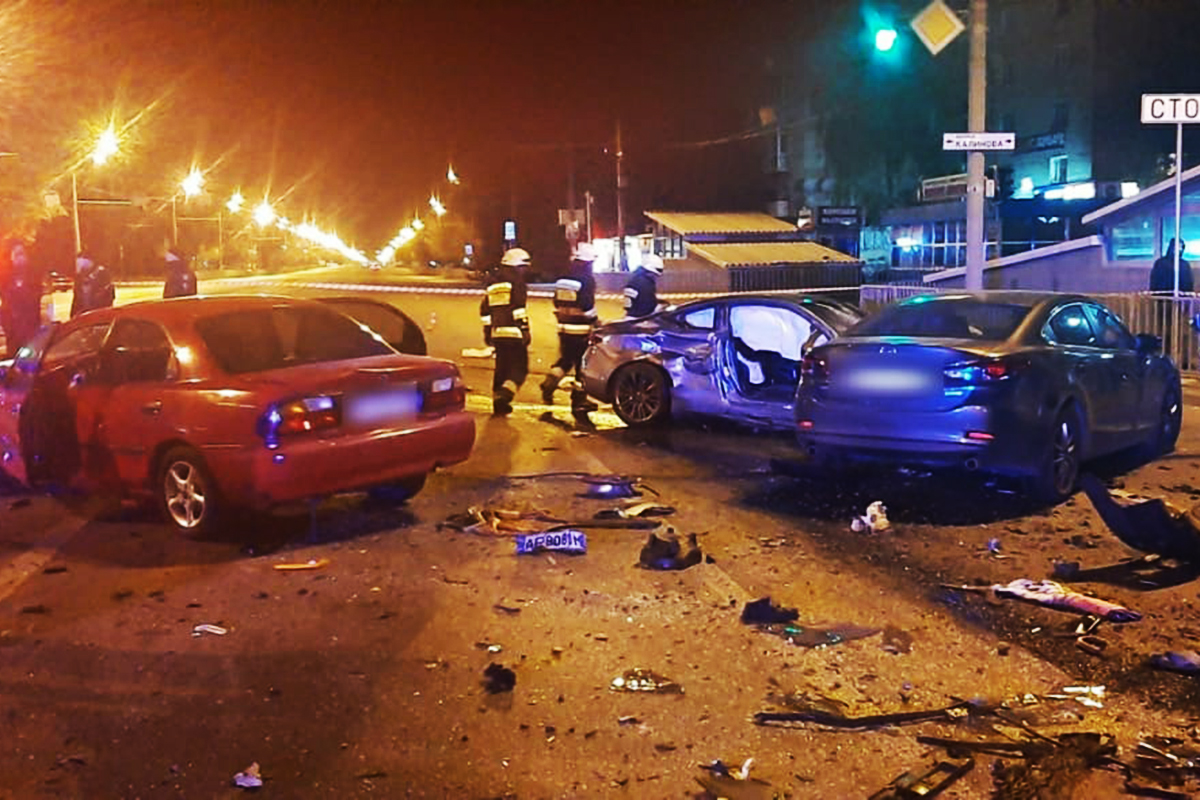 Від удару під час некерованого руху сталося зіткнення ще з трьома автомобілями, які стояли на перехресті на червоний сигнал світлофора.