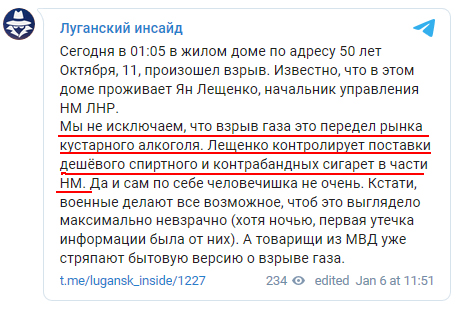 У ніч на 6 січня в Луганську на кварталі 50 років Жовтня прогримів вибух у квартирі, де проживав глава так званої "народної міліції".