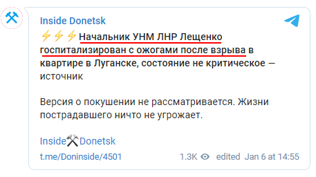 У квартирі проживає начальник "народної міліції ЛНР" Ян Лещенко, його госпіталізували з опіками, без загрози для життя.