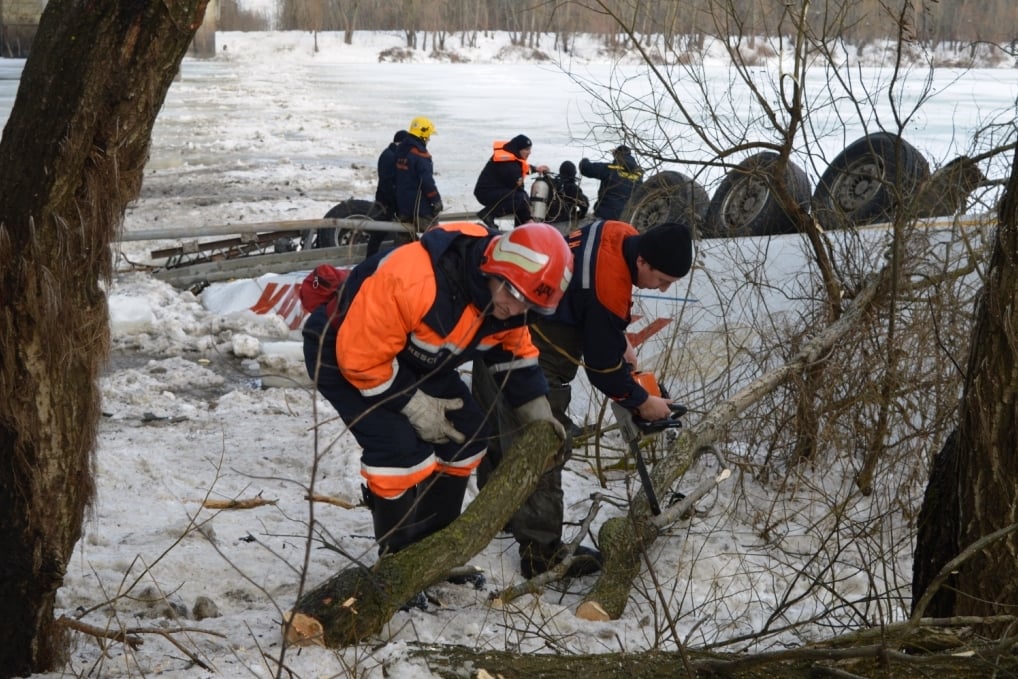 Рятувальники розчистили берег річки, водолази ДСНС обстежили затонулий транспортний засіб і закріпили троси, й за допомогою автокрана та автомобіля "КрАЗ" вантажівку із загиблим водієм вилучили з води.