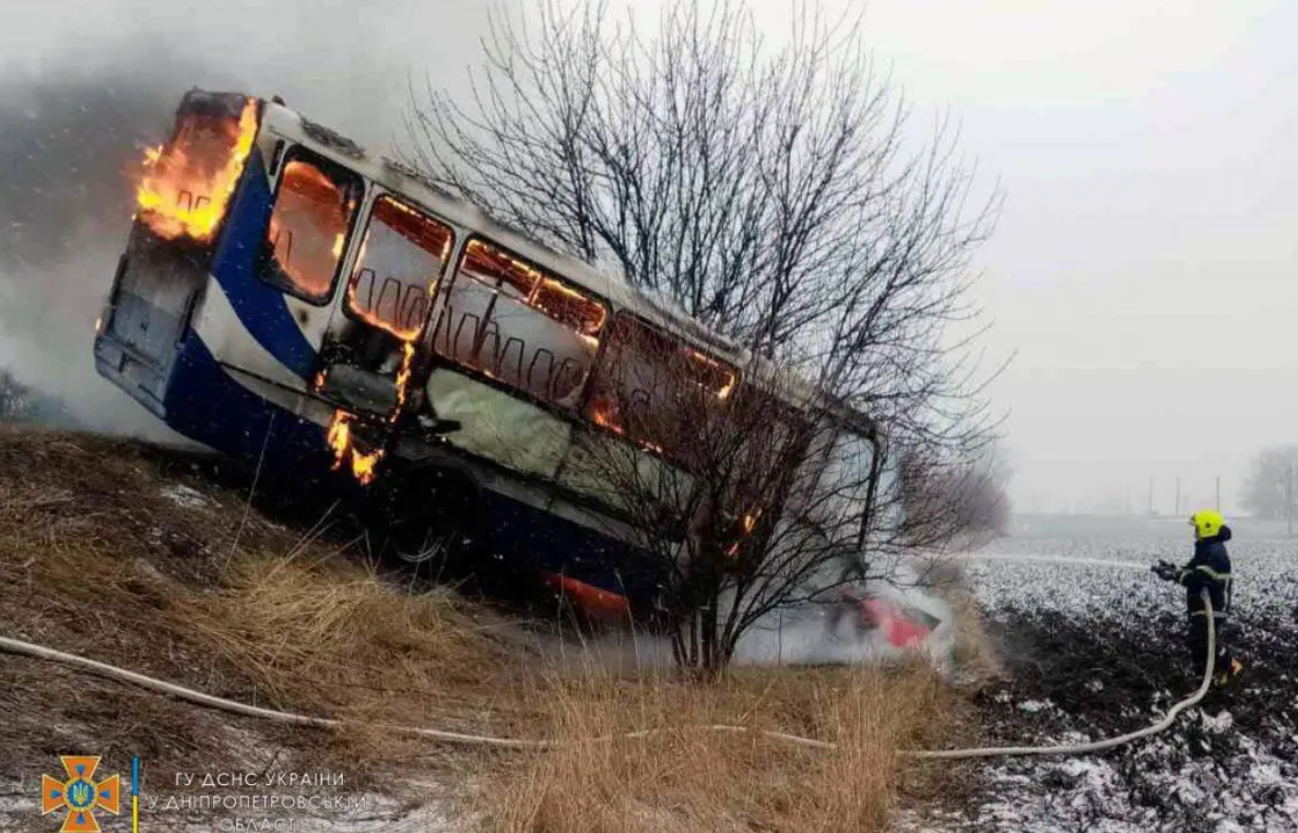 Зіткнулися рейсовий автобус, який їхав за маршрутом "Новомосковськ - Знаменівка" та легковий автомобіль "ВАЗ-2101". Обидва транспортні засоби загорілися.