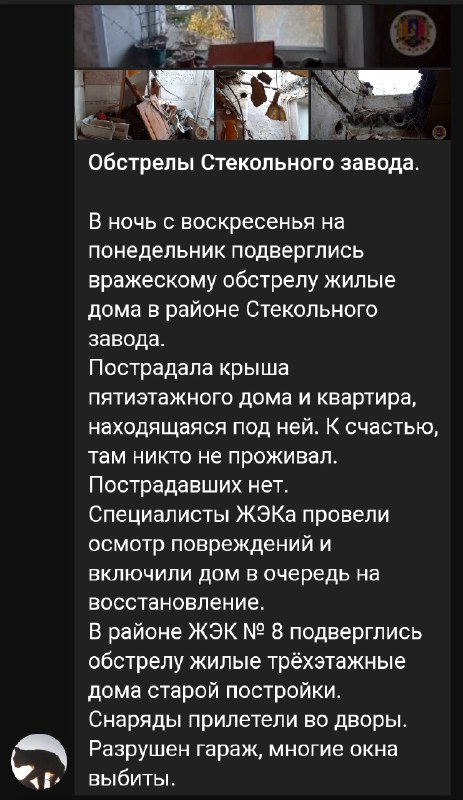 Обстріл стався у ніч на понеділок. Снарядом пробило дах п'ятиповерхового будинку, постраждала квартира, де ніхто не проживав.