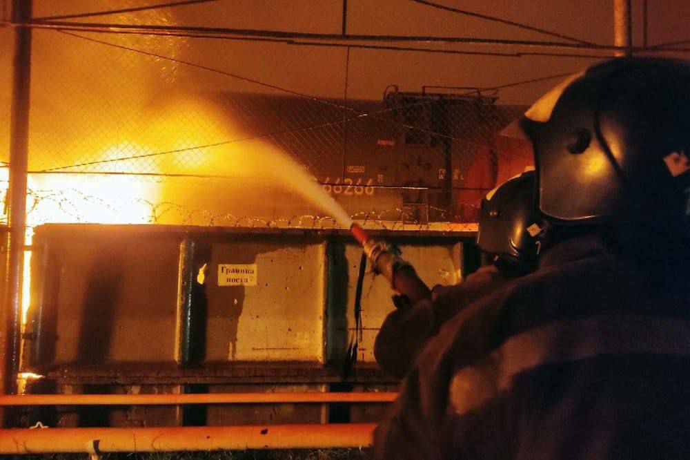 На місці пожежі створено 2 бойові ділянки: одна спрямована на ліквідацію горіння стаціонарних ємностей на площі 300 м кв., друга - на залізничне полотно з цистернами на площі 350 м кв. На місце відправили пожежний потяг.