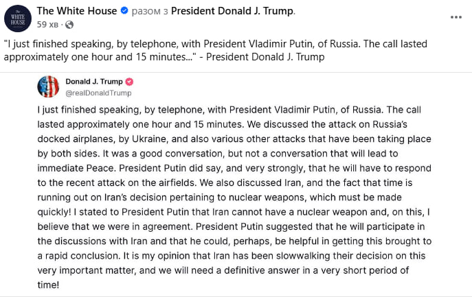 Іран і ядерна загроза: Трамп нагадав Путіну, що Іран не повинен мати ядерну зброю, на що, за його словами, російський лідер погодився. Ба більше, Путін запропонував виступити посередником у переговорах між США та Іраном щодо ядерної програми.