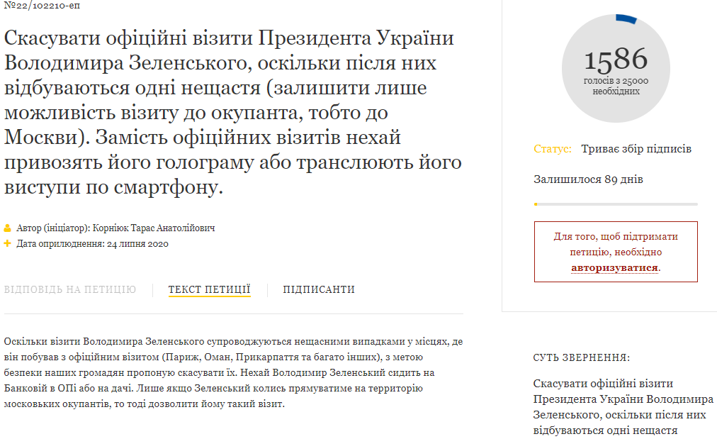 "Оскільки візити Володимира Зеленського супроводжуються нещасними випадками у місцях, де він побував з офіційним візитом (Париж, Оман, Прикарпаття та багато інших), з метою безпеки наших громадян пропоную скасувати їх. Нехай Володимир Зеленський сидить на Банковій в ОПі або на дачі. Лише якщо Зеленський колись прямуватиме на территорію московьких окупантів, то тоді дозволити йому такий візит", - говориться у тексті петиції.