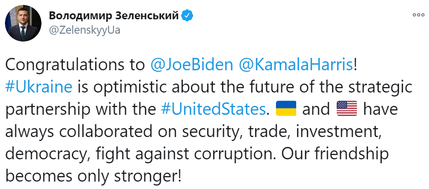 Так, Зеленський привітав Байдена, а також Камалу Харріс, яка повинна стати віце-президентом США.