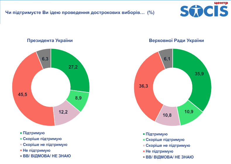 45,5% опитаних заявили, що не підтримують дострокові вибори президента, ще 12,2% "скоріше не підтримують". 27,2% висловилися за такий розвиток подій, ще 8,9% "скоріше підтримують" дострокові вибори голови держави.