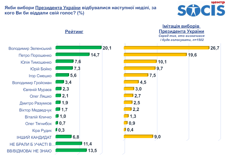 Лідером президентських рейтингів залишається діючий голова держави Володимир Зеленський. Серед тих, хто визначився зі своїм вибором, за нього б проголосували 26,7% респондентів.