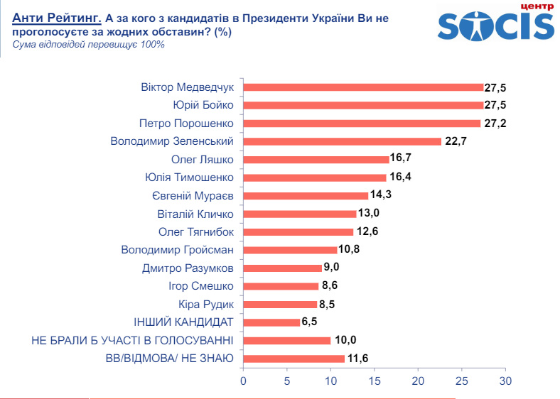 Три потенційні кандидати у президенти мають майже рівну антипідтримку: Віктор Медведчук, Юрій Бойко та Петро Порошенко. Від них трохи "відстає" Володимир Зеленський.