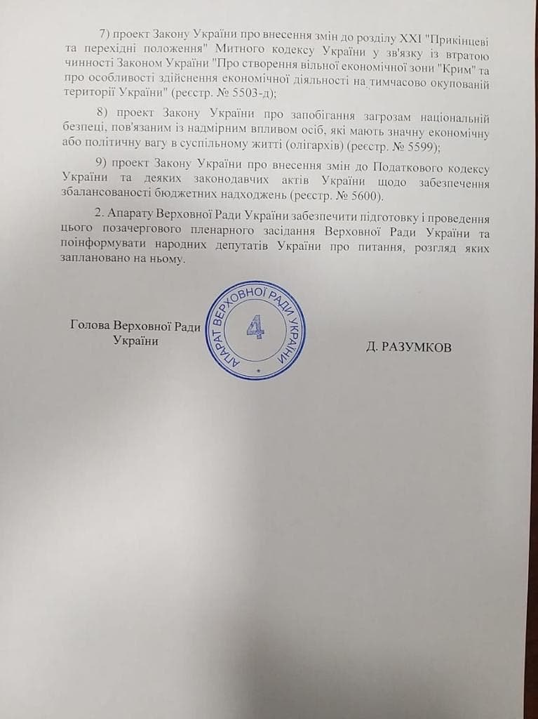 Він оприлюднив відповідне розпорядження спікера парламенту Дмитра Разумкова.