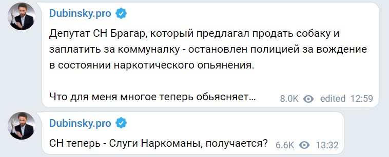 Так, нардеп Олександр Дубінський у своєму Телеграм-каналі написав, що Брагар був затриманий за керування авто у стані наркотичного сп'яніння.
