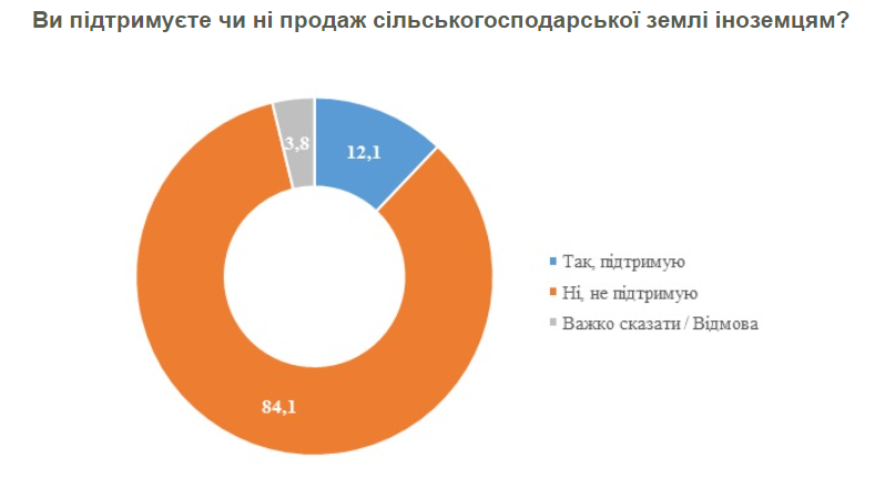 Абсолютна більшість респондентів – 84,1% – не підтримують продаж сільськогосподарської землі іноземцям. Підтримують продаж іноземцям – 12,1% (а ще 3,8% не змогли або відмовилися відповідати).