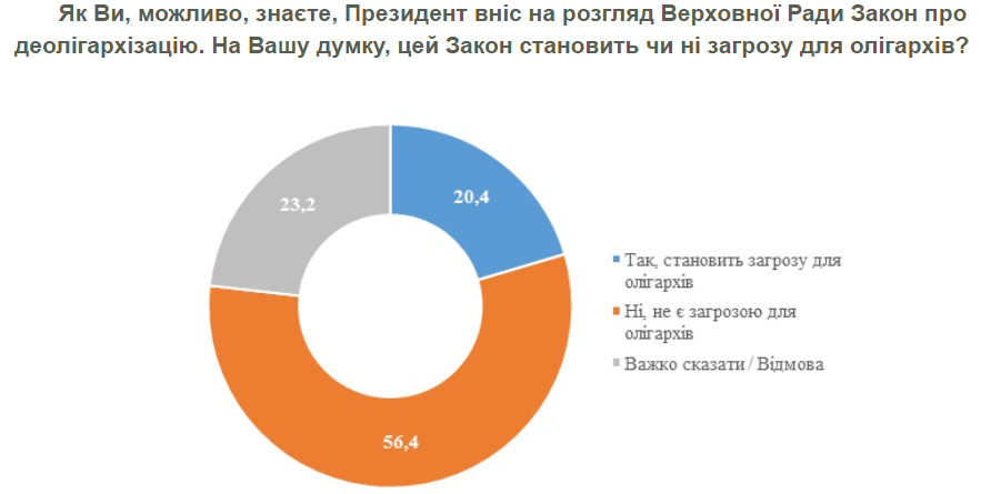 Закон про деолігархізацію, який Верховна Рада вже прийняла за основу , не є загрозою для олігархів. Так вважають більшість жителів України – 56,4%. Натомість 20,4% респондентів вважають, що він становить загрозу для олігархів, ще 23,2% не визначилися або відмовилися відповідати на запитання.