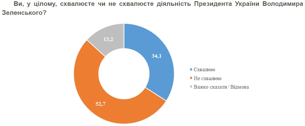 Українці скоріше негативно оцінюють діяльність Президента В. Зеленського: 52,7% не схвалюють його діяльність, а 34,1% - схвалюють. Ще 13,2% не визначилися або відмовилися відповідати на запитання.