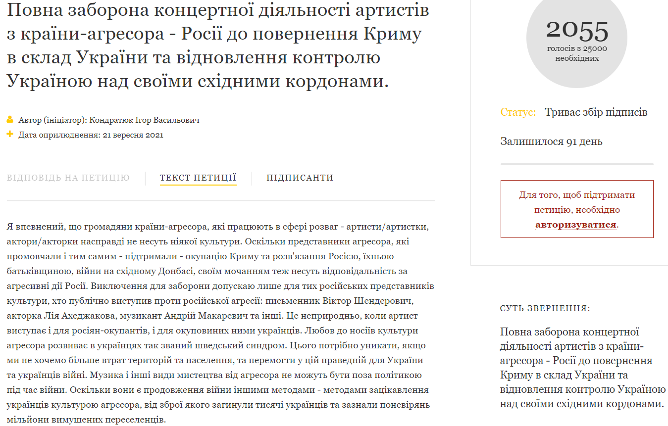 Продюсер Ігор Кондратюк створив петицію до президента, у якій просить повністю заборонити концертну діяльність артистів з Росії до повернення Криму в склад України та відновлення контролю Україною над своїми східними кордонами.