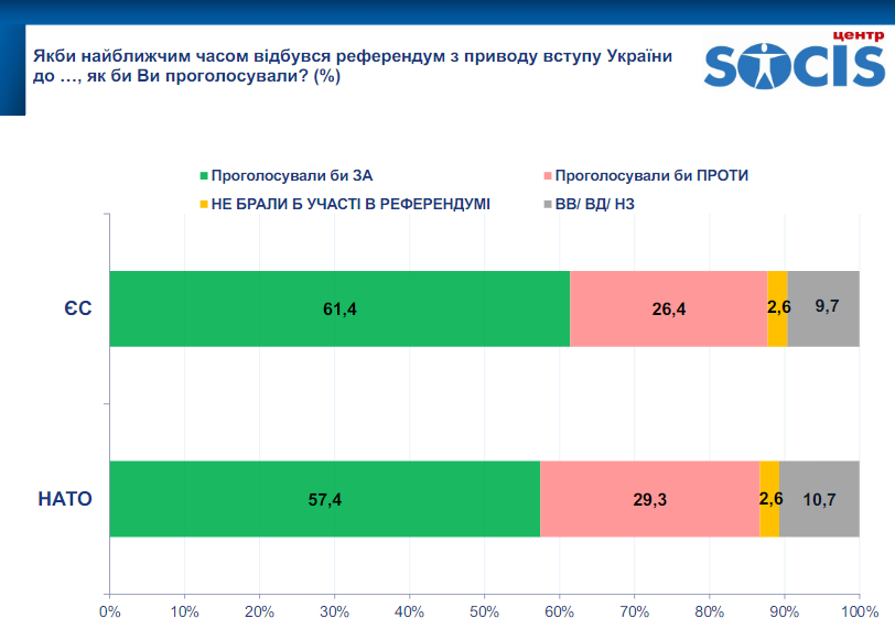 Соціологи дізналися думку суспільства щодо євроатлантичних прагнень України. Так, 61,4% опитаних проголосували б за вступ нашої країни до ЄС, якби таке питання було винесено на референдум, 26,4% проголосували б проти. За вступ України до НАТО виступають 57,4% респондентів, проти - 29,3%.