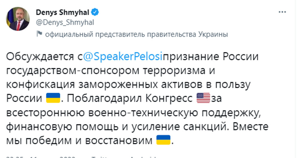 "Щойно обговорили з Ненсі Пелосі визнання Росії країною-спонсором тероризму та конфіскацію заморожених активів на користь України", - написав Шмигаль.