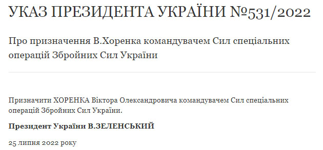 Іншим указом Зеленський призначив на посаду командувача ССО Віктора Хоренка.