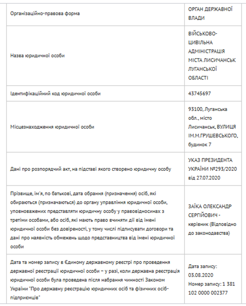 У єдиному державному реєстрі юридичних осіб сьогодні була зареєстрована Військово-цивільна адміністрація м. Лисичанська Луганської області.