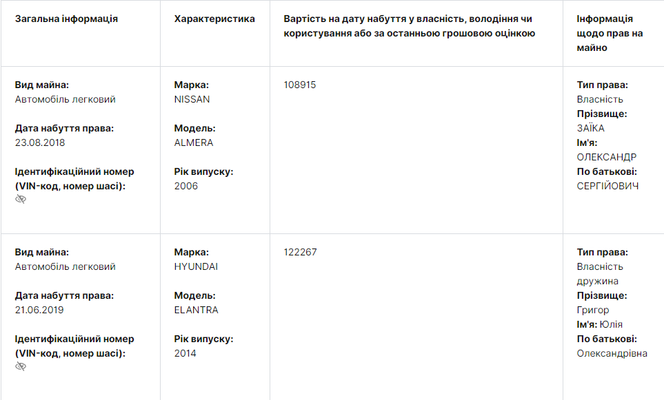 Вказуються доходи Заїки за 2019 рік: зарплата за основним місцем роботи - 47278 грн., надходження від ВЧ А2802 - 338134 грн., дохід від відчуження рухомого майна - 94000 грн., зарплата дружини - 63200 грн.