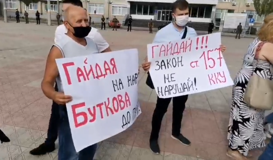 Деякі учасники прийшли на мітинг з плакатами з гаслами проти глави ЛОДА Сергія Гайдая, якого звинувачують в ініціюванні скасування виборів у ряді громад оласті, а також із закликами до президента Володимира Зеленського дати людям право голосу.