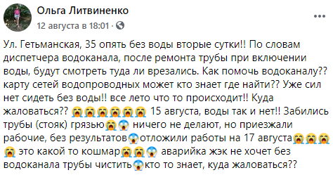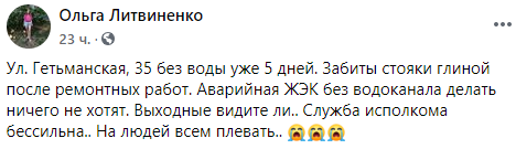 "Вул. Гетьманська, 35 без води вже 5 днів. Забиті стояки глиною після ремонтних робіт. Аварійна ЖЕК без водоканалу робити нічого не хочуть. Вихідні бачте... Служба виконкому безсила... На людей всім начхати", - пише жителька.