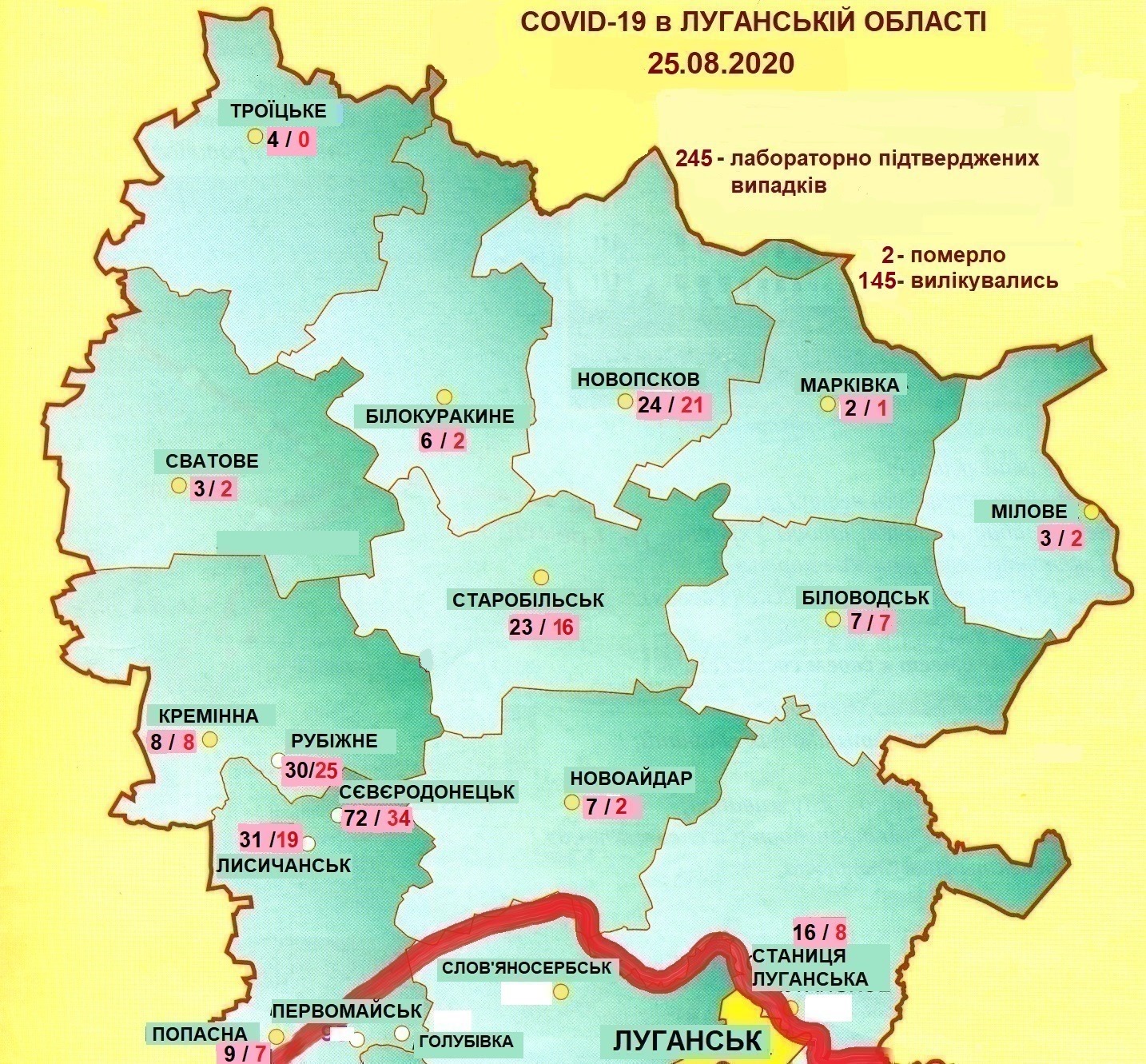 - Станично-Луганський район – 4 (3 особи, які перебували в контакті з раніше захворілими, 1 особа, яка перебувала в самоізоляції після повернення з тимчасово окупованої території);