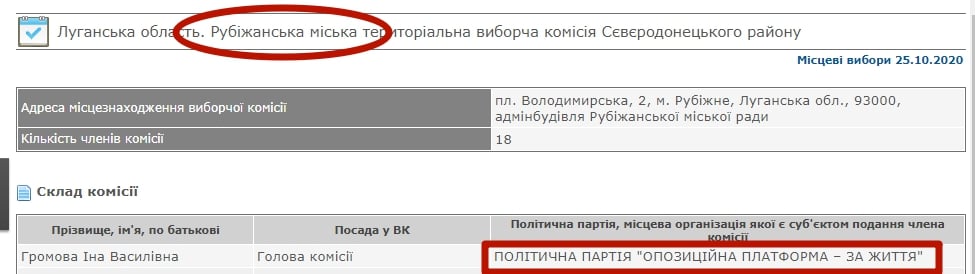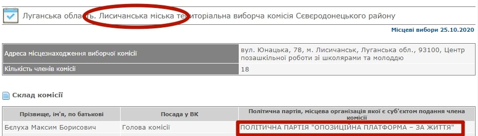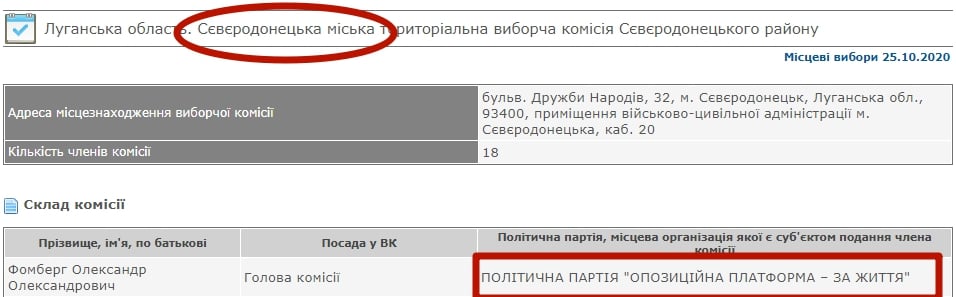 Згідно з інформацією на сайті ЦВК, головою Сєвєродонецької районної територіальної виборчої комісії є член ОПЗЖ Севрюк Едуард Леонідович, Сєвєродонецьку міську ТВК Сєверодонецького району очолює член ОПЗЖ Фомберг Олександр Олександрович, Лисичанську міську ТВК Сєверодонецького району - член ОПЗЖ Бєлуха Максим Борисович, Рубіжанську ТВК Сєверодонецького району - член ОПЗЖ Громова Іна Василівна.