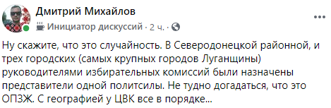 "Ну скажіть, що це випадковість. У Сєвєродонецькій районній, і трьох міських (найбільших міст Луганщини) керівниками виборчих комісій були призначені представники однієї політсили. Не важко здогадатися, що це ОПЗЖ. З географією у ЦВК все в порядку..." - пише автор поста.