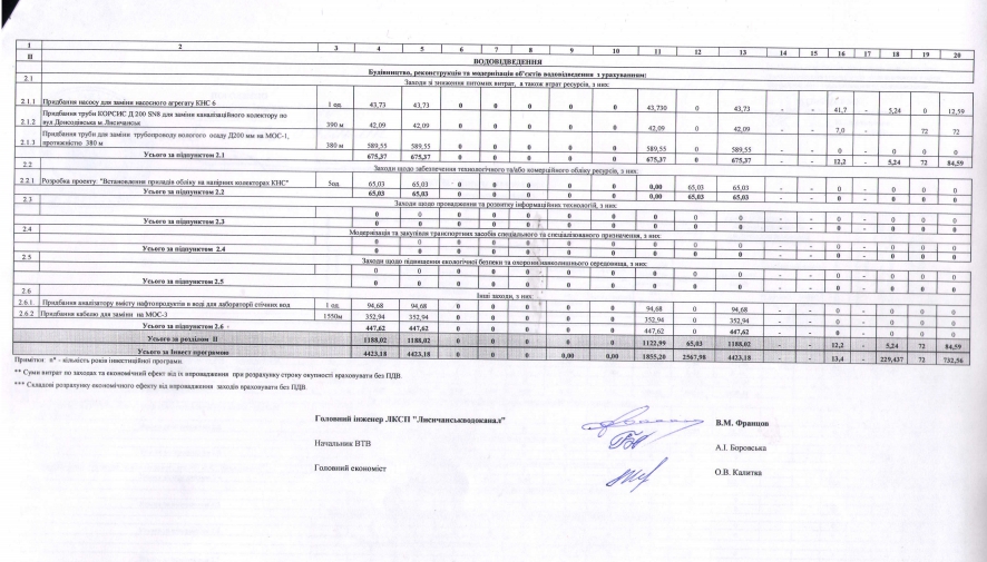 Інвестиційний план стосується як водопостачання, так і водовідведення. Зокрема, передбачається придбання нового обладнання на ВНС "Новодружеськ", ВНС "Привілля", ВНС "Білогорівская", покупка труб і кабелю, а також аналізаторів домішок.