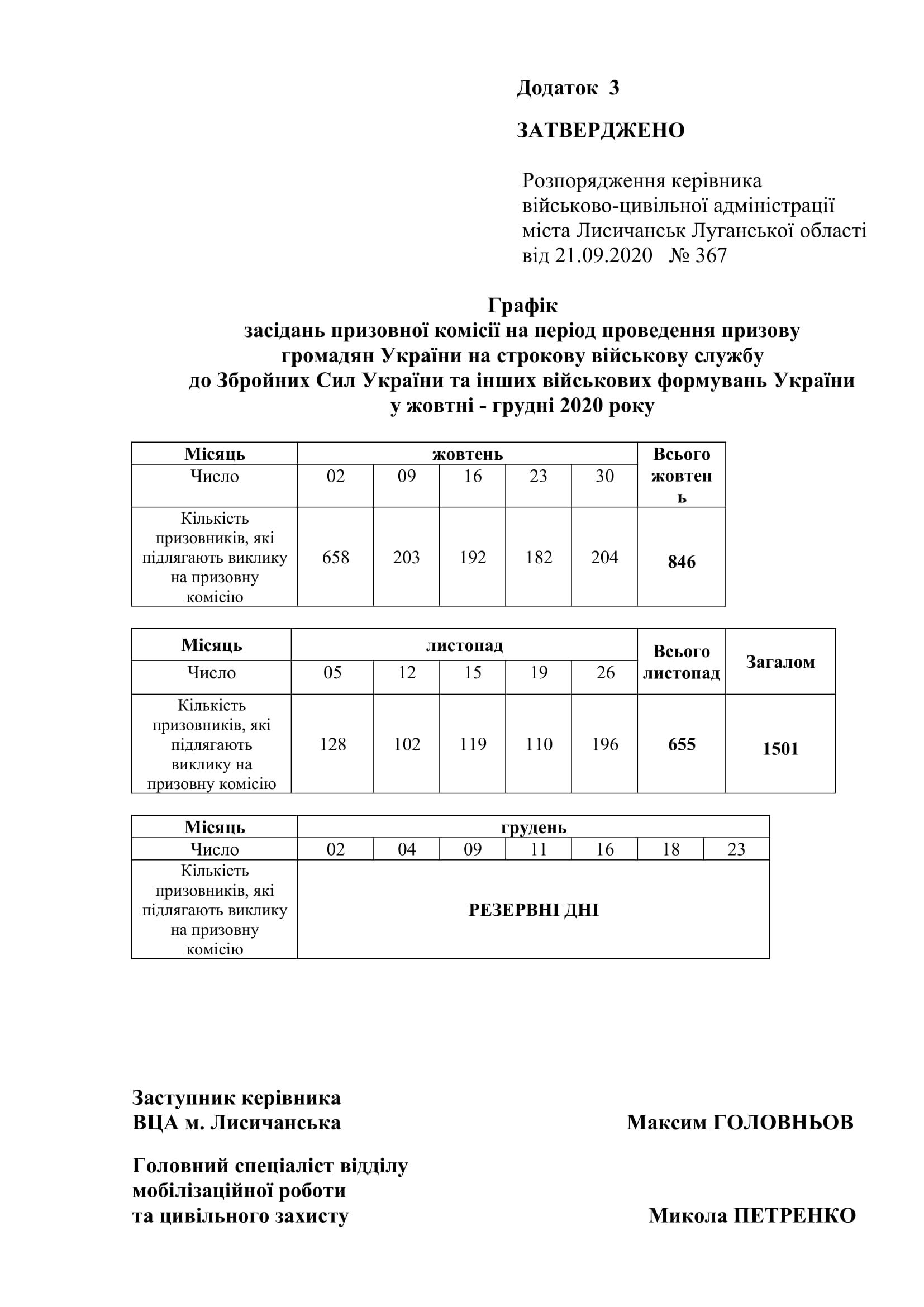 Керівник військово-цивільної адміністрації Лисичанська Олександр Заїка підписав розпорядження "Про організацію підготовки та проведення призову громадян України на строкову вiйськову службу до Збройних Сил України та інших військових формувань України у жовтні-грудні 2020 року".