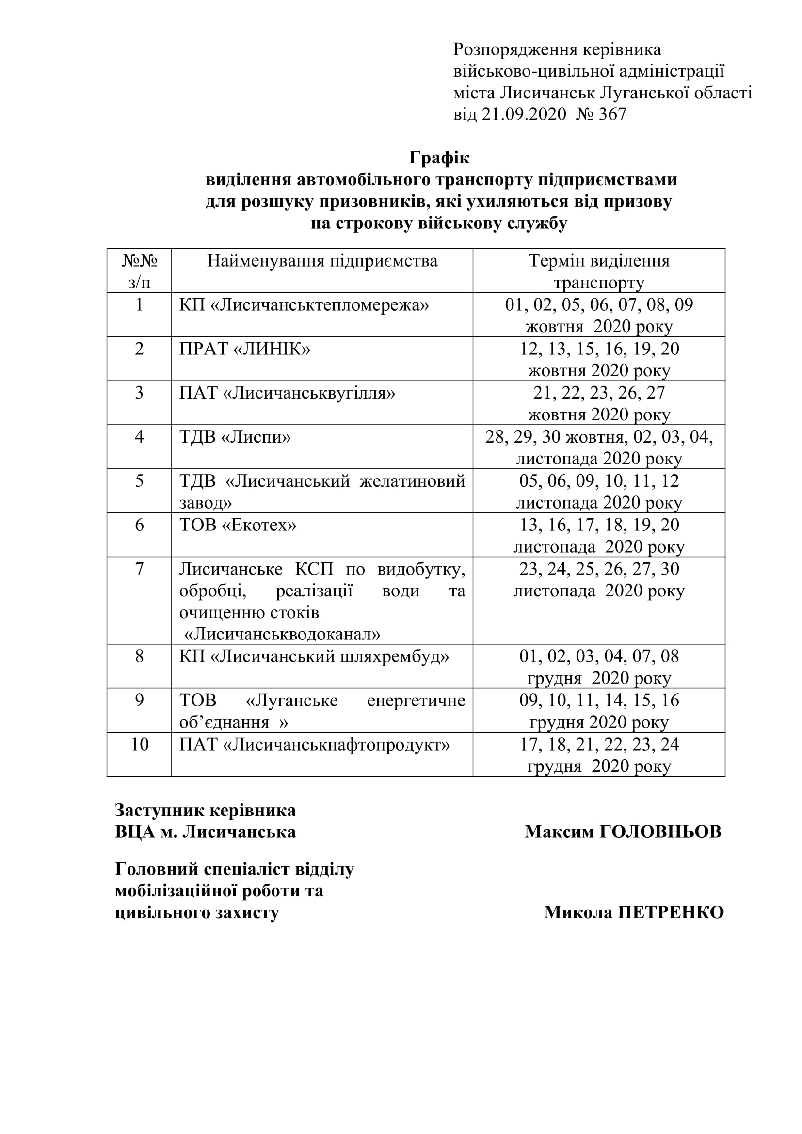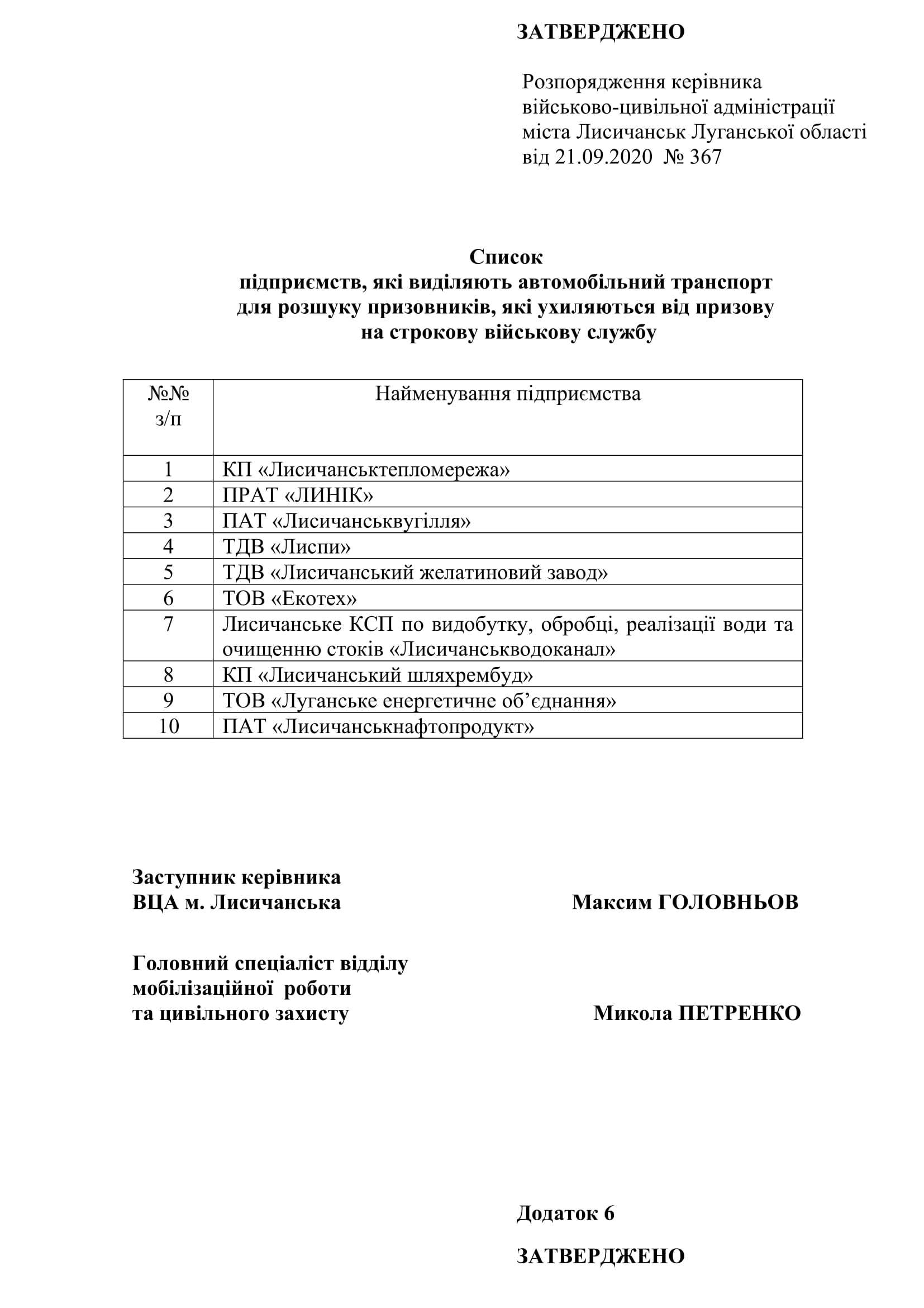 Затверджено список підприємств, які виділять автомобільний транспорт для розшуку призовників, які ухиляються від призову на строкову вiйськову службу, а також графік виділення транспорту.