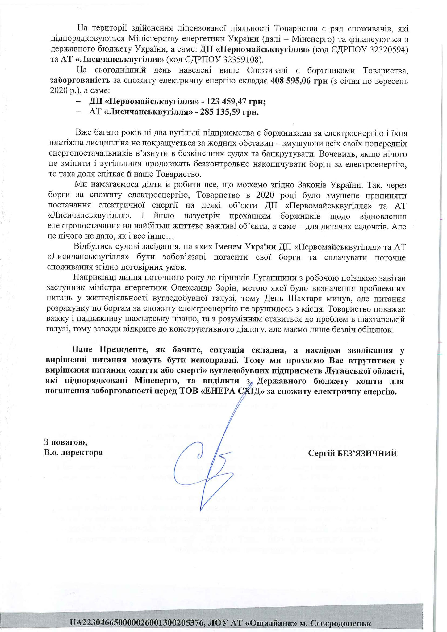 Зазначається, що через борги за спожиту електроенергію ЕНЕРА СХІД в 2020 році була змушена припиняти постачання електричної енергії на деякі об’єкти ДП «Первомайськвугілля» та АТ «Лисичанськвугілля», але це нічого не дало.