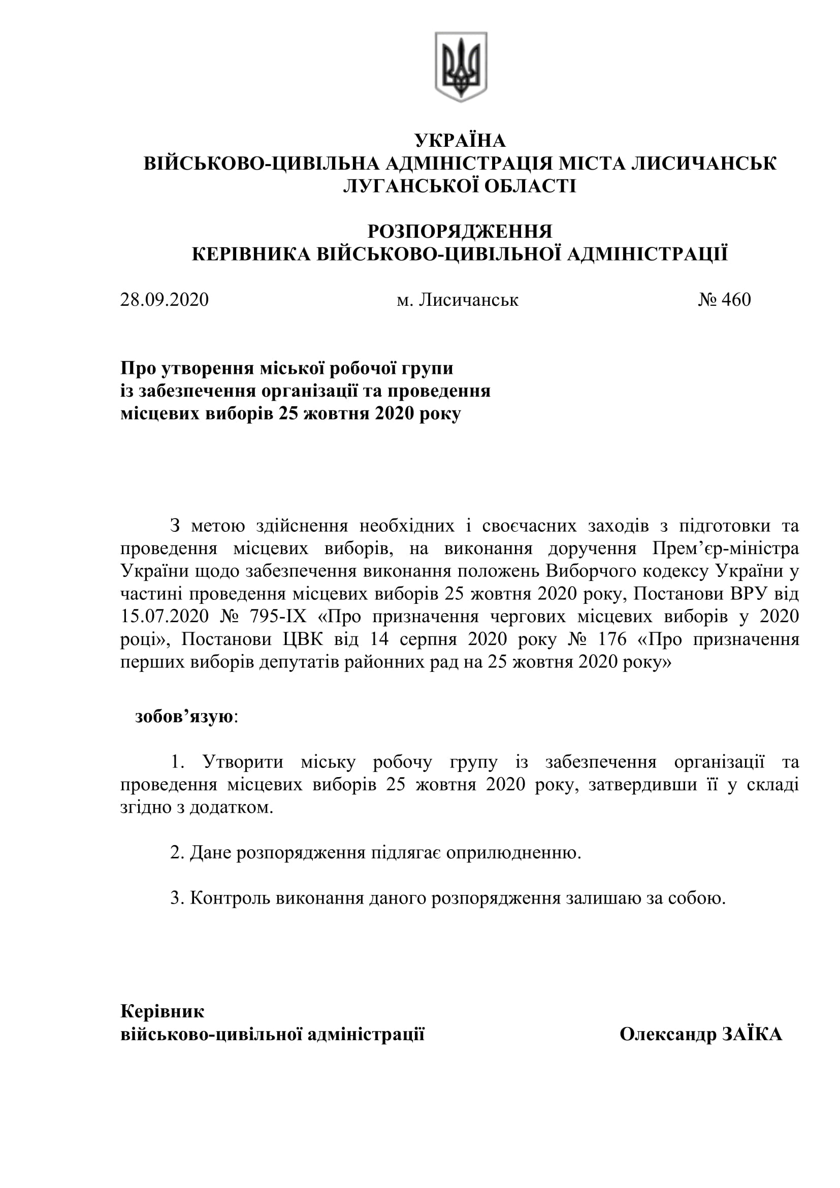 Керівник військово-цивільної адміністрації Лисичанська Олександр Заїка підписав розпорядження "Про утворення міської робочої групи із забезпечення організації та проведення місцевих виборів 25 жовтня 2020 року".