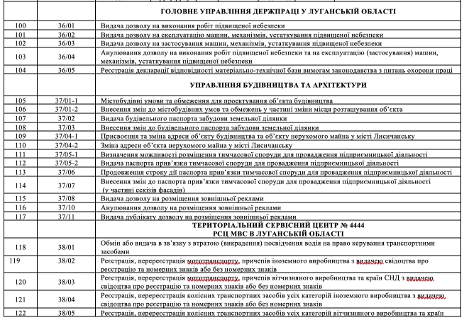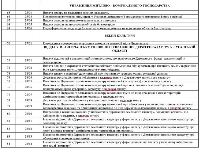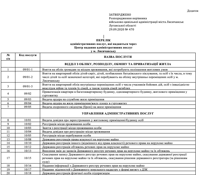 Відповідне розпорядження "Про затвердження Переліку адміністративних послуг, які надаються через Центр надання адміністративних послуг у м.Лисичанськ" було оприлюднено 29 вересня поточного року, передає Час Пік з посиланням на офіційний портал ВЦА.