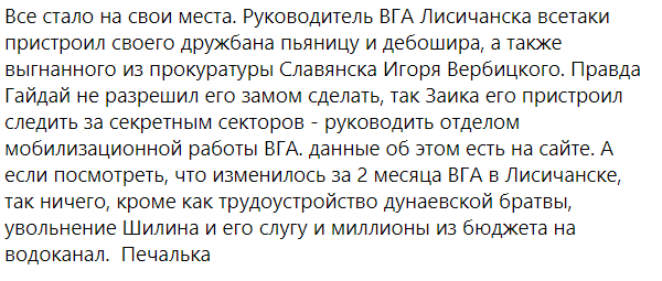 На сайті Лисичанської ВЦА з'явилося розпорядження "Про утворення міської робочої групи щодо забезпечення організації та проведення місцевих виборів 25 жовтня 2020 року". Згідно з ним, на посаду начальника відділу мобілізаційної роботи та цивільного захисту призначений Ігор Вербицький - колишній прокурор, який проявив себе як п'яниця та дебошир.