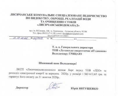 ЛЕО анонсувало знеструмлення "Лисичанськводоканалу" з 30 жовтня, передає Час Пік.