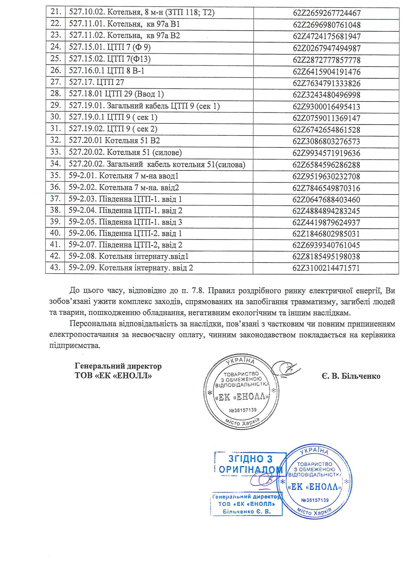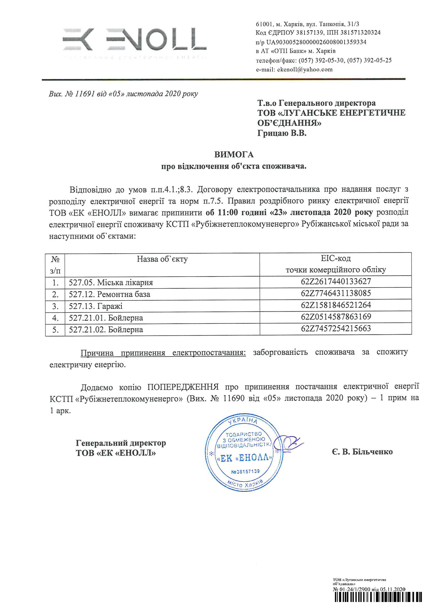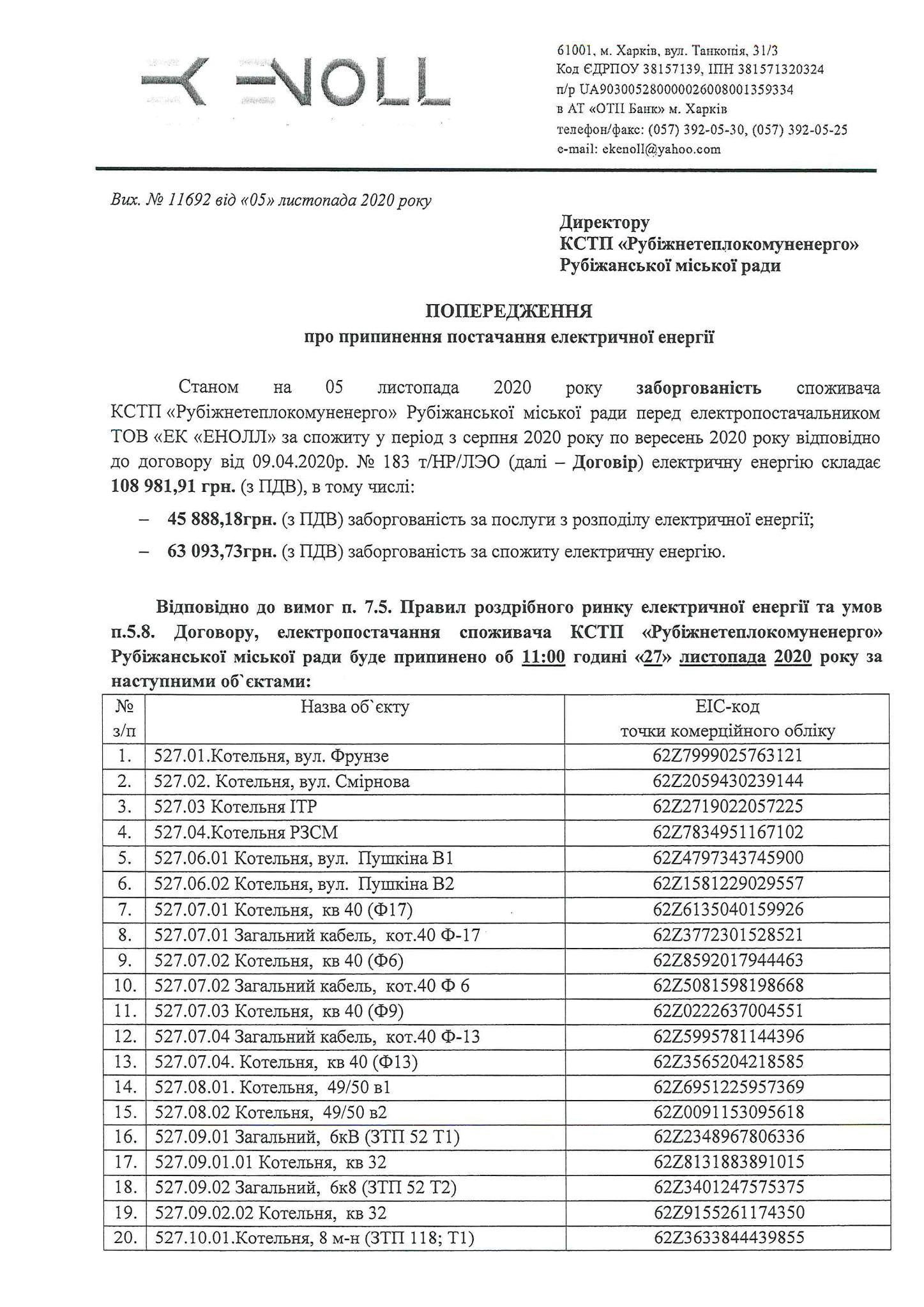 "23.11.2020 та 27.11.2020 року буде припинено надання послуг з розподілу електричної енергії об'єктам споживача КСТП "Рубіжнетеплокомуненерго" Рубіжанської міської ради на вимогу ТОВ "ЕК"ЕНОЛЛ" через існуючу заборгованість",-йдеться у повідомленні.