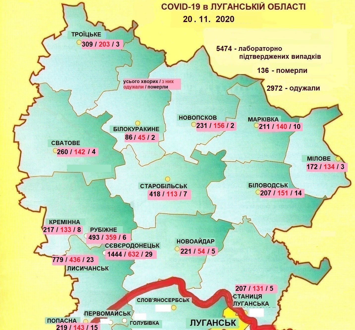 За результатами епідеміологічного нагляду за СОVID-19, в Луганській області станом на 20.11.2020 усього лабораторно підтверджено 5474 випадків коронавірусної хвороби.