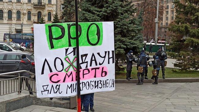 Сьогодні в центрі Києва знову проходить протест підприємців проти локдауна і введення реєстраторів розрахункових операцій.
