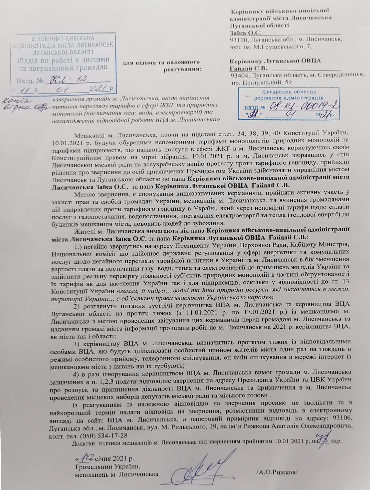Громадський активіст Анатолій Рижков оприлюднив у Фейсбуці фото звернення, яке було направлено керівнику ВЦА Лисичанська Олександру Заїці та голові ЛОДА Сергію Гайдаю, передає Час Пік.